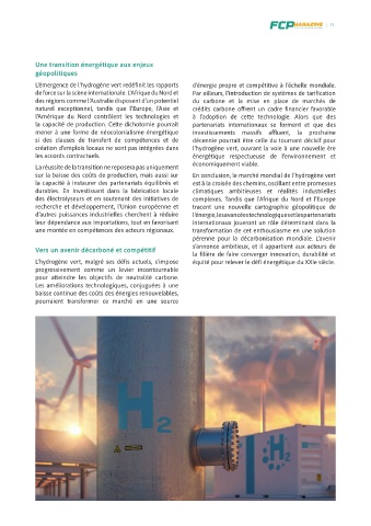 Dans le secteur des transports, l’hydrogène vert est entre énergie solaire et électrolyse pour alimenter des la capacité de production. Cette dichotomie pourrait partenariats internationaux se forment et que des