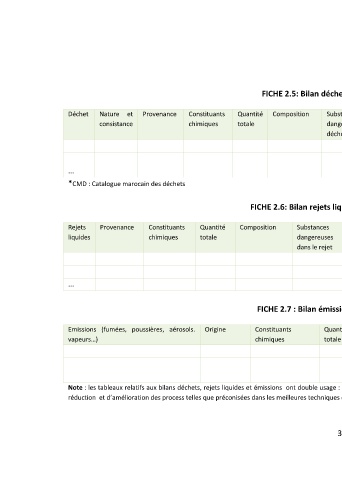 Note : les tableaux relatifs aux bilans déchets, rejets liquides et émissions ont double usage : servir à établir les registres dans le cas des contrôles et rechercher également les mesures de